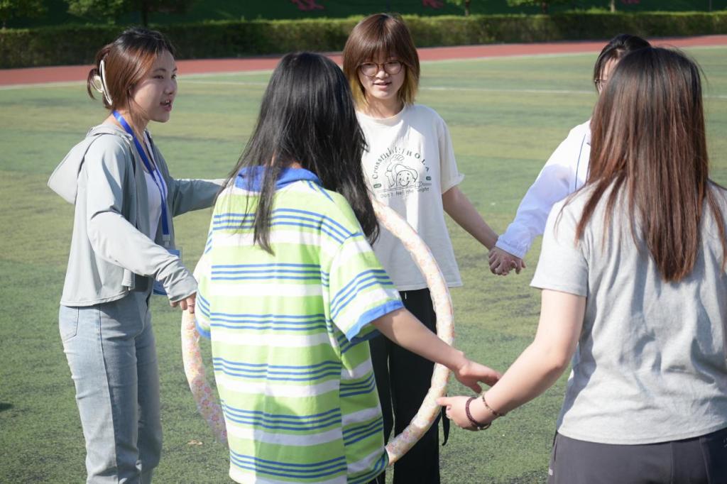 (3)活动规则:团队成员手拉手围成一圈,用呼啦圈穿过所有人的身体回到原位,在活动过程中,不能以语言为沟通工具,只能依靠肢体语言和眼神进行沟通,相互拉着的手不能放开,也不能用手指去勾呼啦圈。