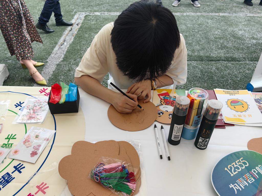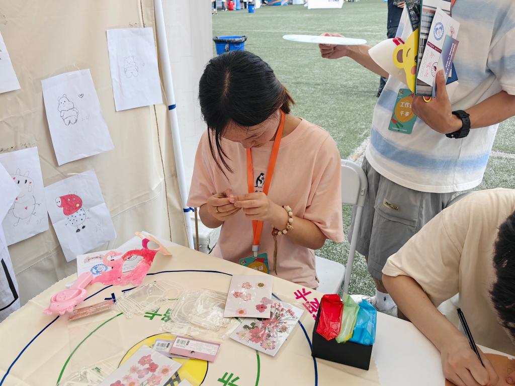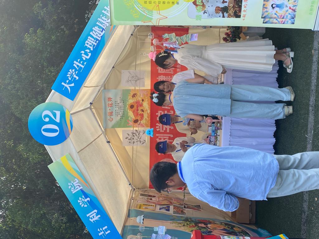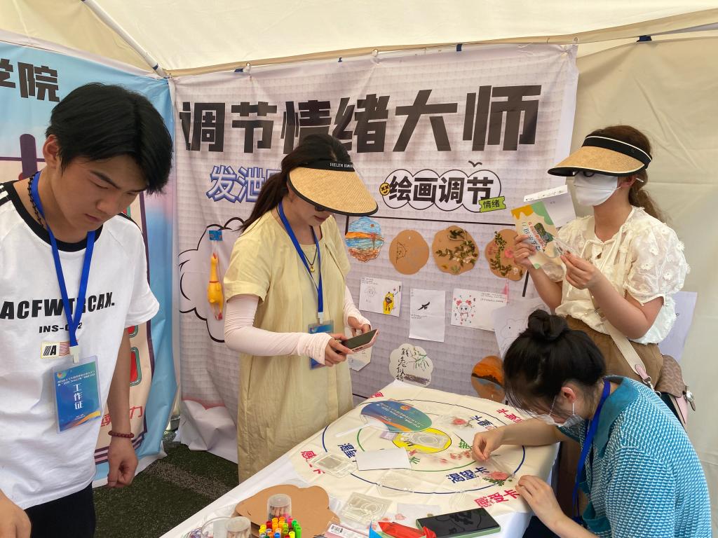 活动伊始,心理协会紧锣密鼓装点展位,布置主展板、粘贴活动海报、张贴成果展示,设置了文创产品展示区和活动体验区域,精心准备了团扇创作、走心桌游体验等活动。展位门庭若市、座无虚席,活动深受参与者喜爱。