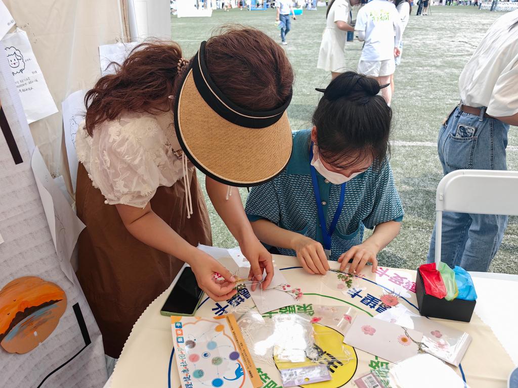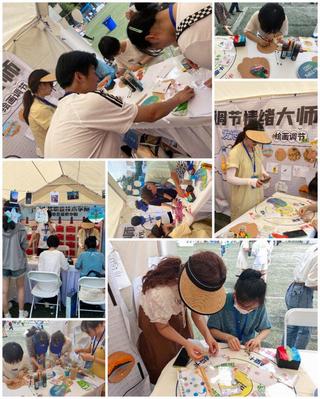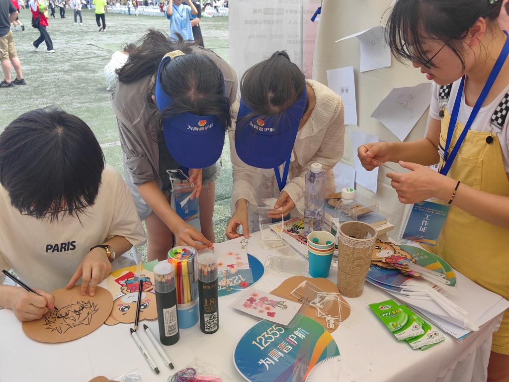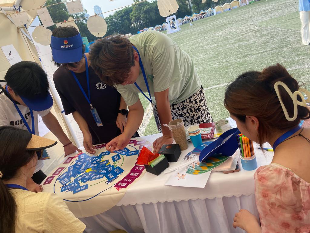 活动伊始,心理协会紧锣密鼓装点展位,布置主展板、粘贴活动海报、张贴成果展示,设置了文创产品展示区和活动体验区域,精心准备了团扇创作、走心桌游体验等活动。展位门庭若市、座无虚席,活动深受参与者喜爱。