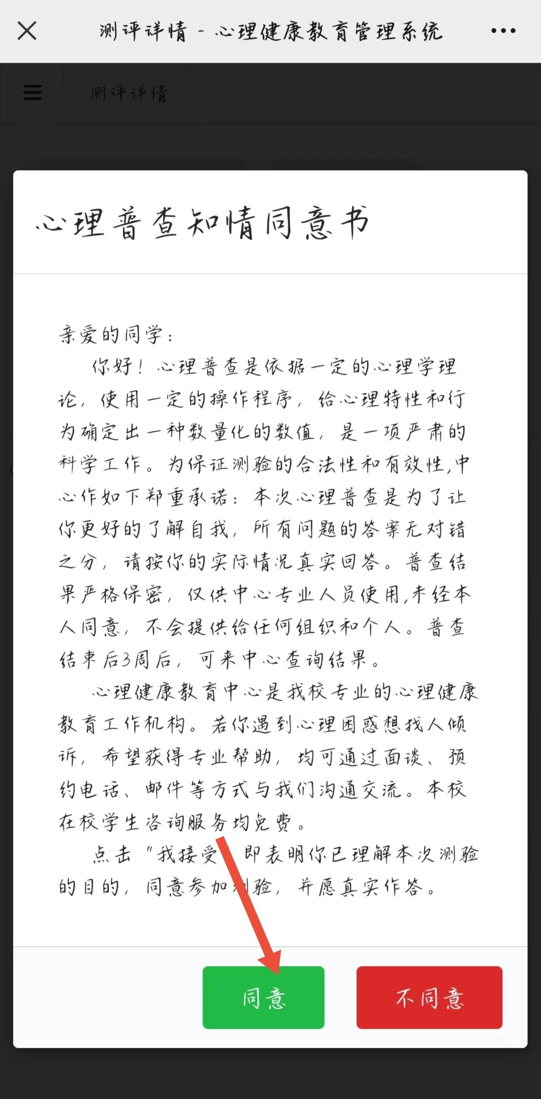 4.进入“心理测评”后输入个人信息后点击“同意”进行心理测评。