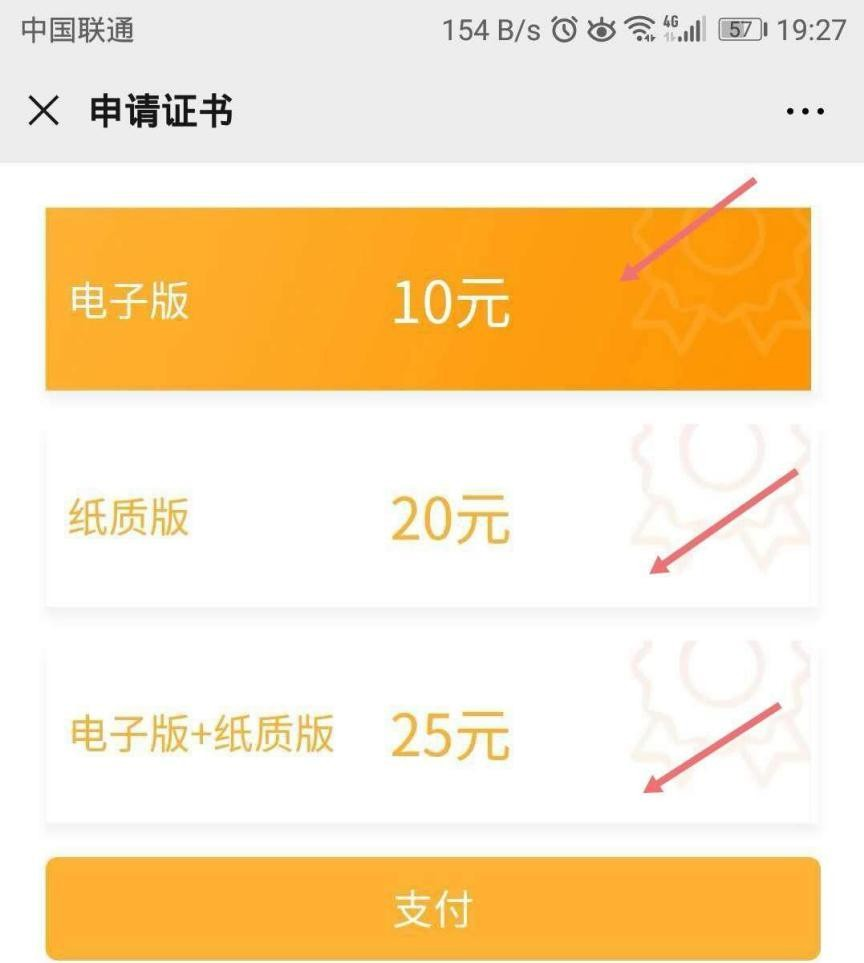 2.证书分为电子版、纸质版和电子版+纸质版3种,点击箭头方向选择自己需要的证书类型后微信支付即可。