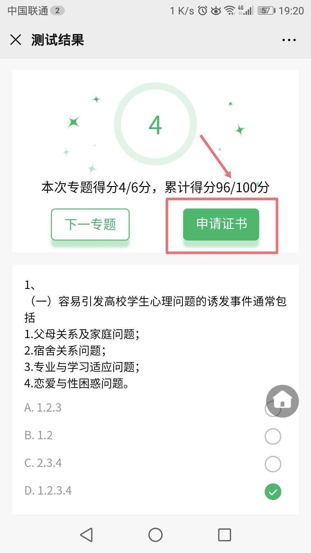1.测试完成后,成绩满80分(总分数100),就可以领取心理委员MOOC培训合格证书啦!